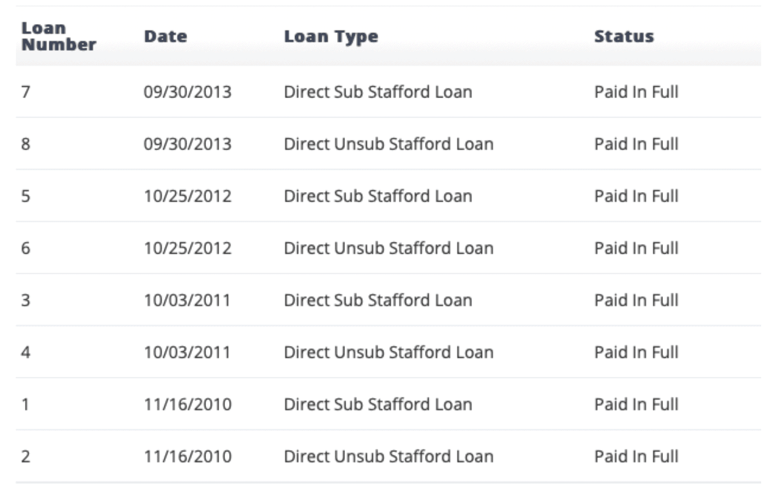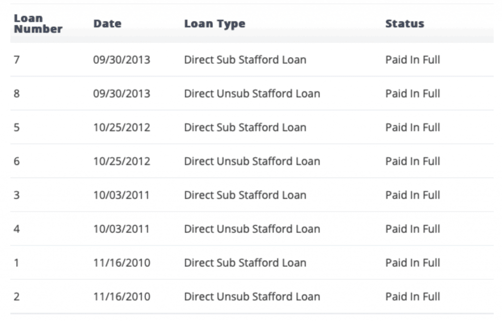I learned that there are two types of student loans: federal and private. During my four years, I took out 8 federal loans. That meant that my monthly payment was over $500 and my interest rates varied from 3.4% to over 6% per loan.