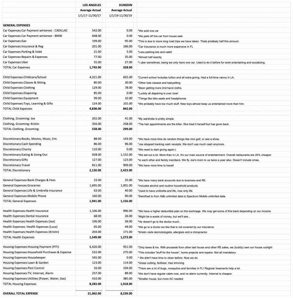 Our old Los Angeles monthly expenses vs our new Florida monthly expenses