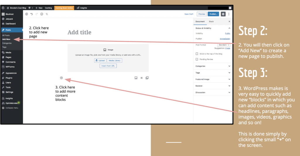 WordPress makes is very easy to quickly add new “blocks” in which you can add content such as headlines, paragraphs, images, videos, graphics and so on! This is done simply by clicking the small “+” on the screen.