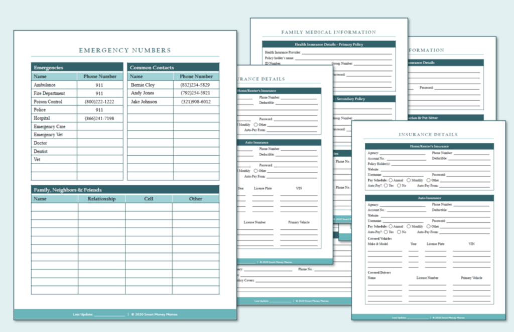 An emergency binder is a way to store financial information, like bank account numbers and passwords. You can store insurance information, personal details about you and each member of your family, information about bills, and more.