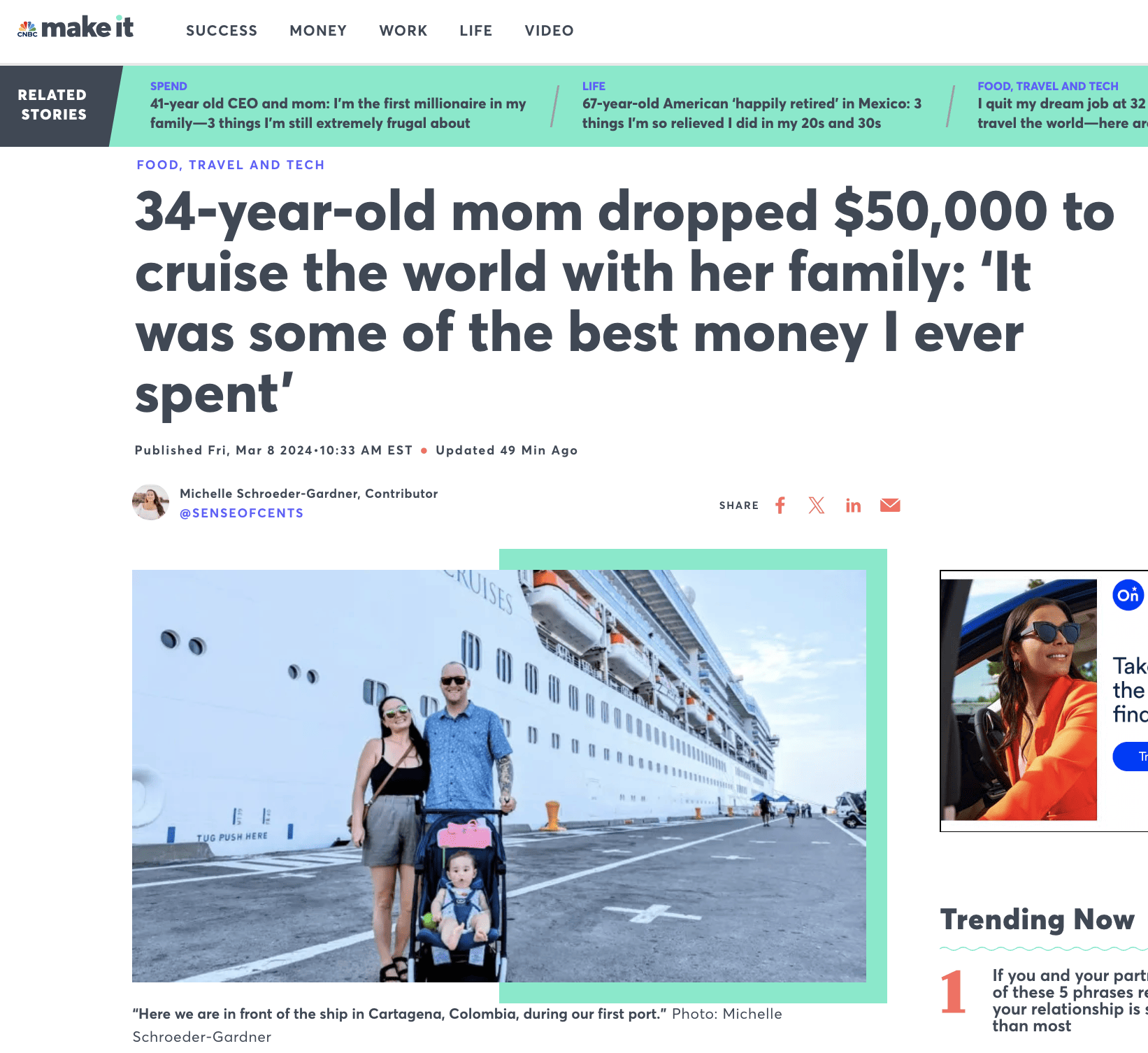 You can read the CNBC article here – 34-year-old mom dropped $50,000 to cruise the world with her family: ‘It was some of the best money I ever spent’