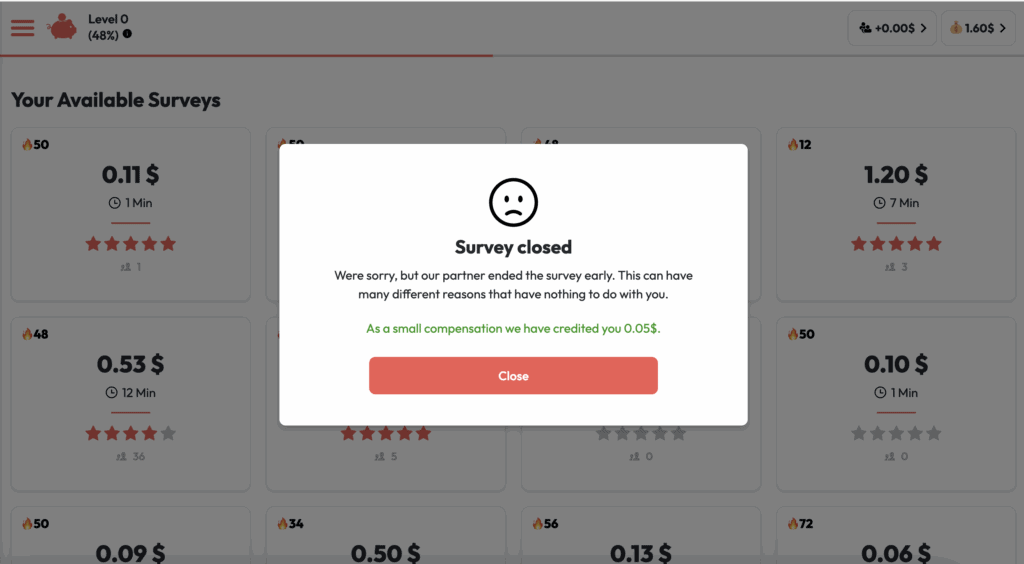 - Better luck with short surveys: Personally, I had more success sticking with shorter surveys. I felt like I wasted less time and had a higher chance of actually finishing the survey and getting paid.