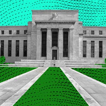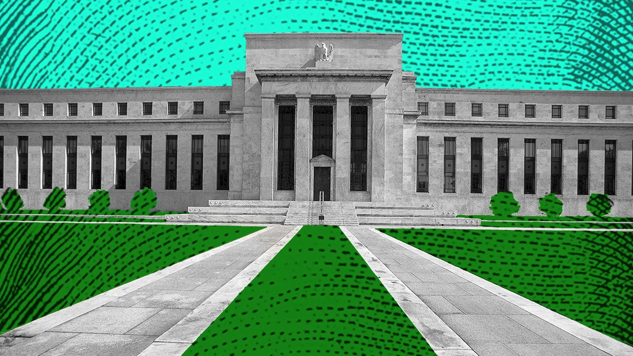 Fed Chair Jerome Powell is superimposed over the Fed Building, looking pensive