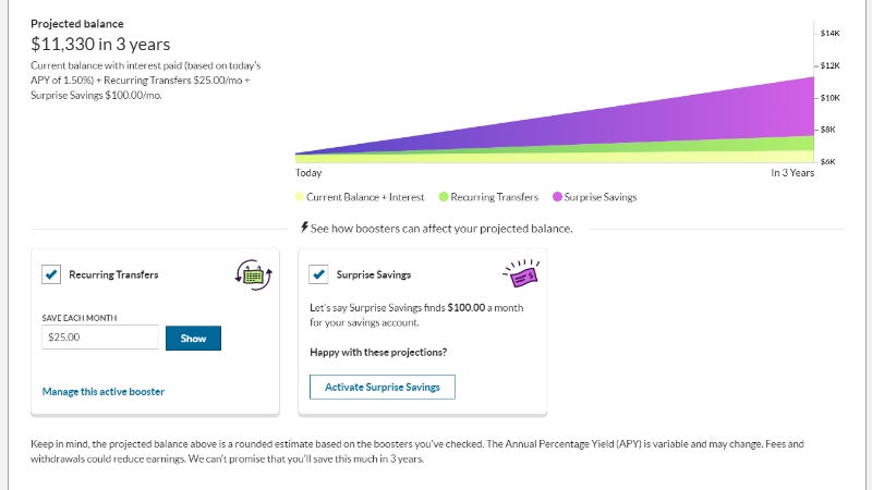 Another feature now available allows for “surprise savings.” This booster looks at how much money is in your checking account, determines the amount you typically spend and sweeps any leftover money that could be saved into your online savings account at Ally. Here, it’s also possible to have money pulled from your primary checking account, even if it’s from an entirely different bank.