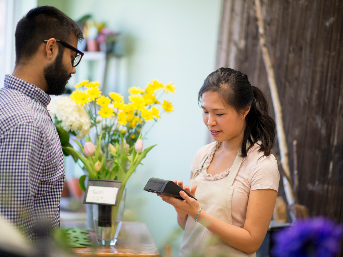 Woman paying with a credit card in a boutique store.