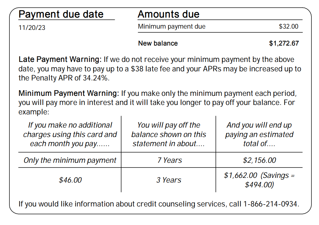 In accordance with amendments to the Truth in Lending Act, you’ll see a minimum payment warning in the payment information section cautioning you about the consequences of only making minimum payments on your credit card balance. This is paired with calculations for how much time and money you would save if you increase your monthly payment.