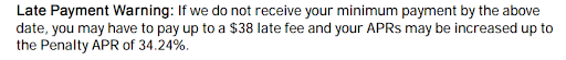 Even if you’ve made every credit card payment on time, you’ll still see a late payment warning on each credit card statement. Paying less than the minimum requirement or missing the payment due date will lead to a late fee and potentially a spiked interest rate which are both outlined in the late payment warning.