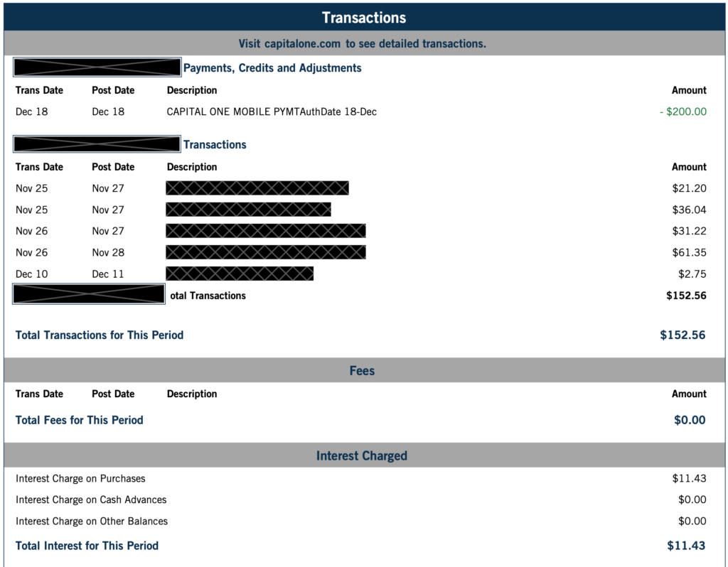 This is potentially the most useful section on your credit card statement. Your transactions section itemizes all of the purchases, charges, statement credits and payments you’ve made within the billing cycle. Each line shows the following information about the posted transactions:
