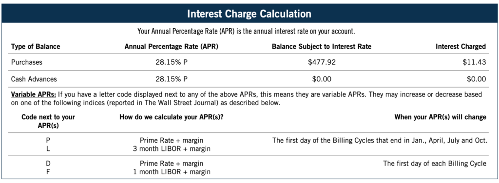 This interest charge calculation will also outline the specific times when the APR is set to change, depending on how your account is coded. It outlines how your APR is calculated, which is the sum of two or more of these factors: