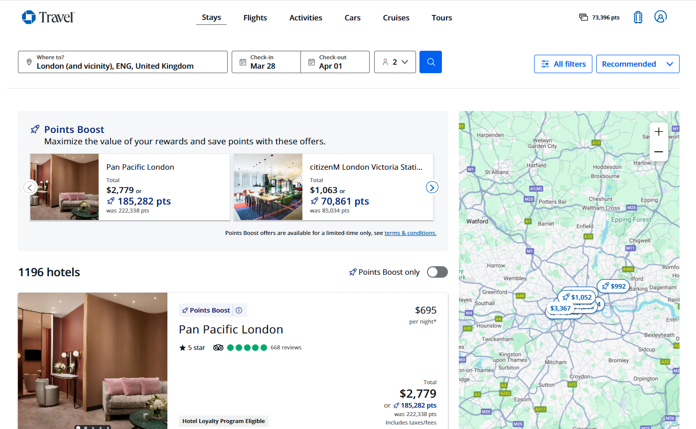 In this sample search, 91 hotel properties are available with Points Boost offers, though the exact value of each offer varies. For example, to book a Deluxe King room at the Pan Pacific London using Points Boost with a Chase Sapphire Preferred, you’d pay 185,282 points instead of 223,338 — a 17-percent decrease. At a cash price of $2,779.23 for a four-night stay, this offer bumps the value of your points to 1.5 cents per point.