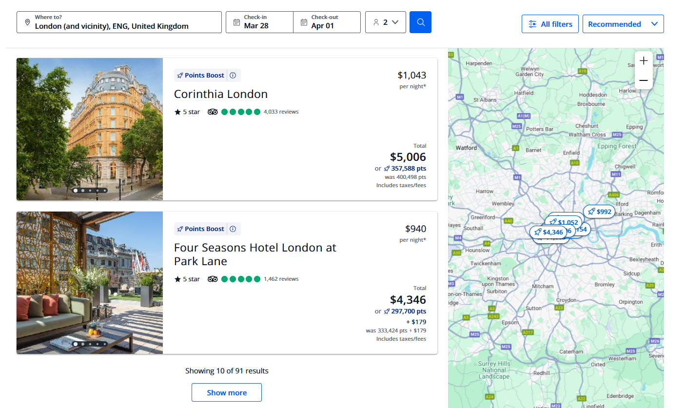 However, the same search also turns up a listing for the Corinthia London, which offers a four-night stay in a Superior Room for 357,588 points or a $5,006.23 cash rate. This offer delivers a value of 1.4 cents per point — still a better deal than the standard 1 cent per point redemption value, but not the best you can do with the Points Boost program.