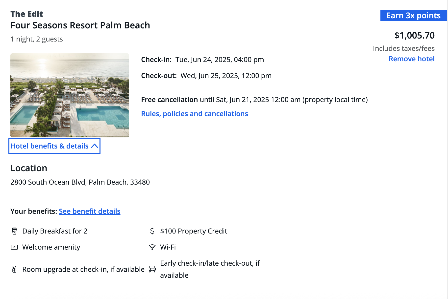 Once you begin your checkout, you can review the property benefits offered by clicking “Hotel benefits and details”.