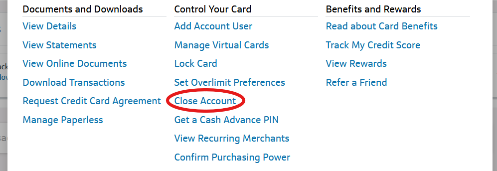 - Select “Close Account.” This option will be located under the “Control Your Card” section.