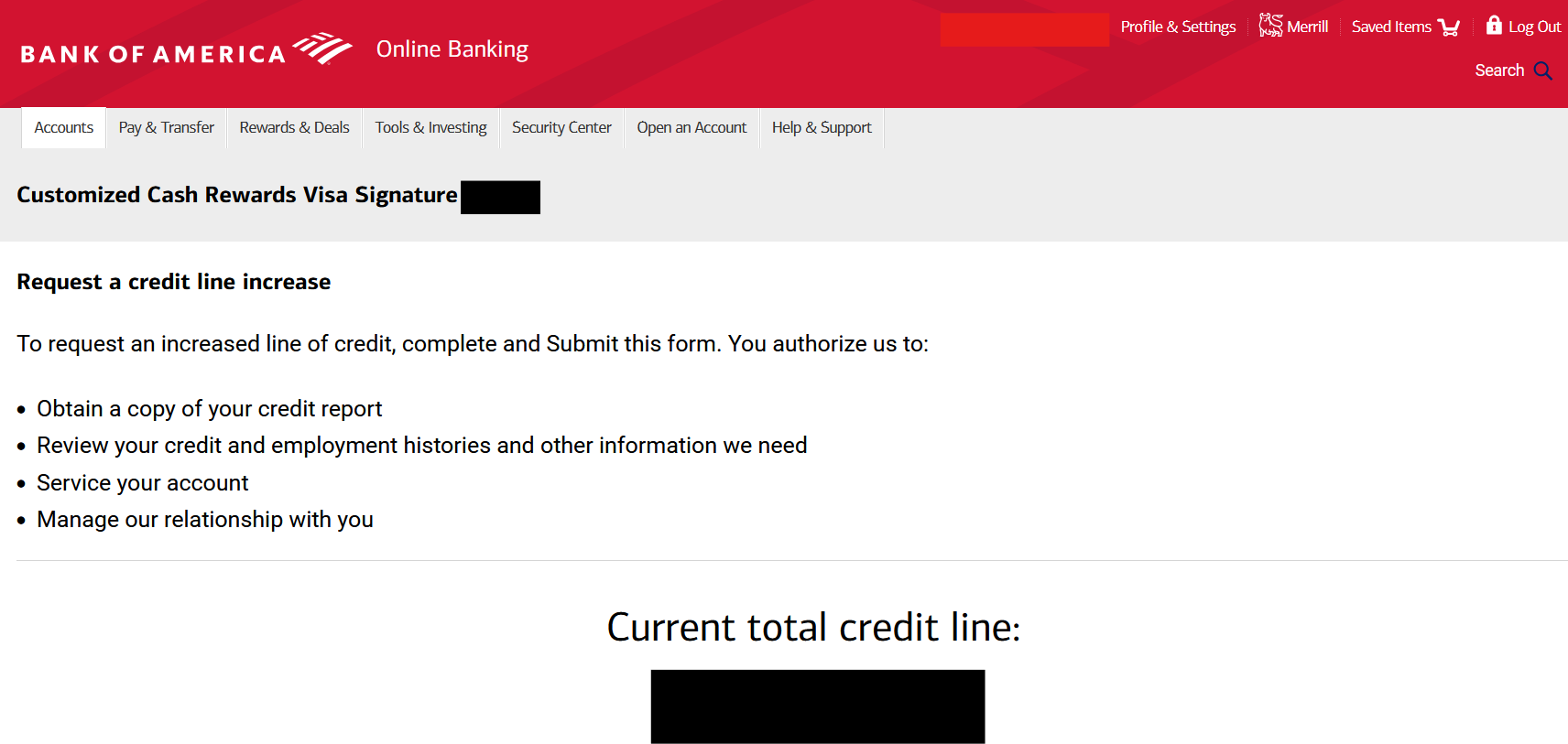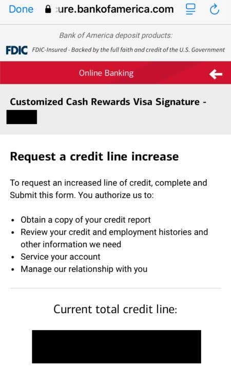 Getting your credit line increased might not be as straightforward as you think. On their request form, Bank of America notes that they may instead move credit “from an account with a lower APR and/or fee structure to a higher annual rate and/or fee structure without increasing your overall credit limit.” So, while your credit limit for one card might increase, your credit limit for another card might decrease.