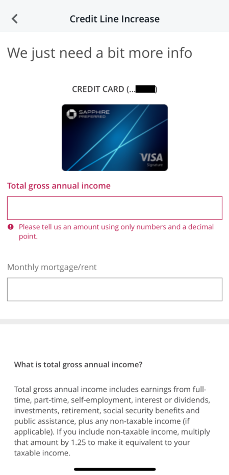 If you have multiple cards, you can choose which you’d like to request a credit limit increase for. From there you’ll be asked to input information regarding your gross annual income and your monthly rent or mortgage payment.