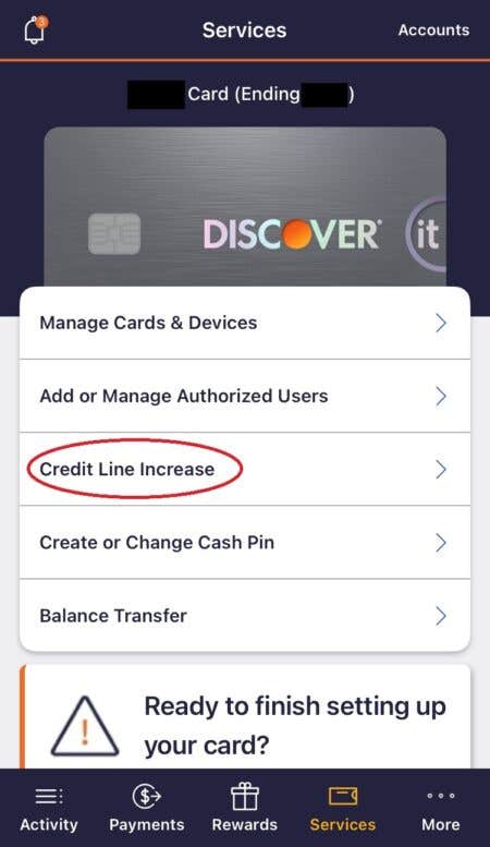 If you’re using the Discover app, select “Services” from the bottom toolbar, followed by “Credit Line Increase.”