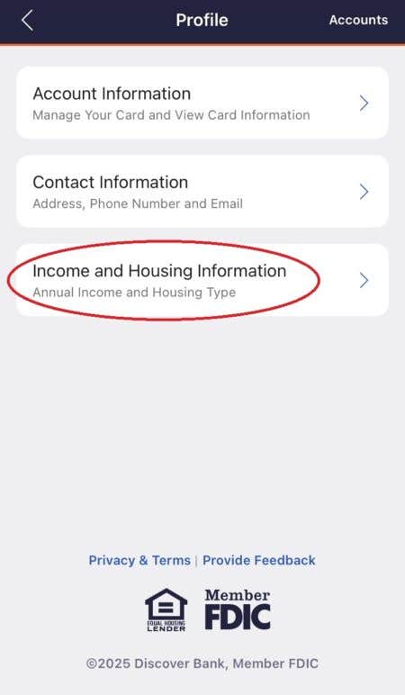 After you’ve increased your income, make sure to update your Discover account with your new gross annual earnings. If you’re using the Discover app, follow these steps: