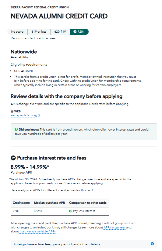I’m not eligible for the first result returned in my search — the Sierra Pacific Federal Credit Union’s Nevada Alumni Credit Card* — and there’s no apparent way the tool’s filters could have been configured to exclude it.