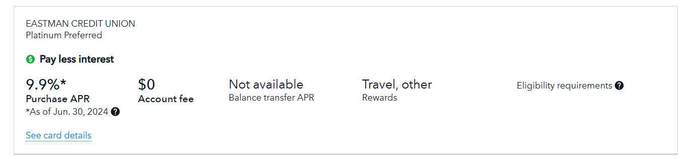 Filtering my search to travel rewards puts Eastman Credit Union’s Platinum Preferred Visa* in the top spot of my results. Digging into their website reveals that I’ll earn at least 1 point for every $1 spent on everyday transactions. Although it says I can redeem these points for airline tickets, hotel accommodations, car rentals, cruises, vacation packages, and destination activities and excursions, I can’t see the redemption rates for these options until I’m a cardholder. There’s no way for me to compare their value to the Chase Ultimate Rewards and American Express Membership Rewards I already earn to see if its rewards program makes sense for me and the way I travel.