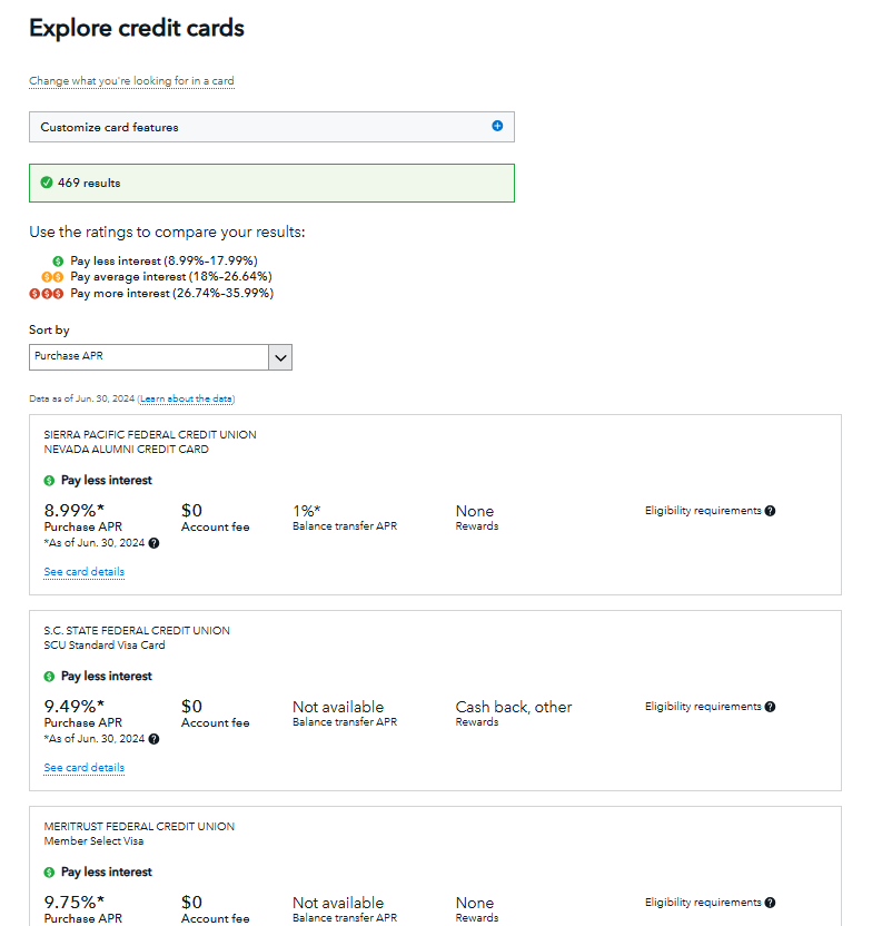 Inside the Explore Credit Cards tool