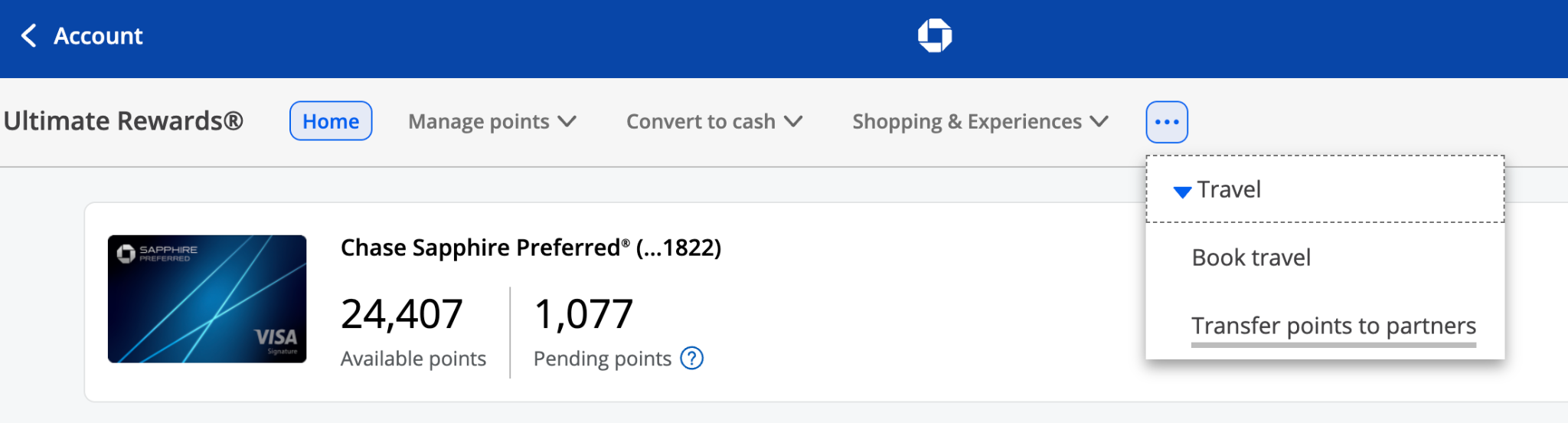- Log in to your Ultimate Rewards account and select the “Travel” drop down and “Transfer points to partners.”