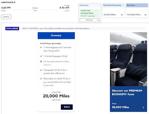 You’ll need to be flexible if you want to find economy award flights at the lowest possible rate, but they’re absolutely out there. For example, my search yielded the following one-way economy flights from Chicago (ORD) to Paris (CDG) for 20,000 Air France miles plus $97.20 per person in airline taxes and fees.