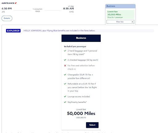 For example, I found one-way business-class flights from New York (JFK) to Amsterdam (AMS) for 50,000 miles plus $243.70 in airline taxes and fees. The longest leg of this flight (New York to Paris) takes place on an Air France Boeing 777-300, which features fully flat-bed seats with a 1-2-1 configuration. This is much better than flying economy for a reasonable number of miles, and having a lie-flat seat will make it easier to sleep peacefully all night while you move toward your destination.