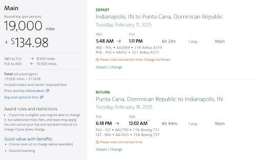 As an example, I found these round-trip flights from Indianapolis, Indiana, (IND) to Punta Cana, Dominican Republic, (PUJ) for just 19,000 miles, plus $134.98 per person in taxes and fees.
