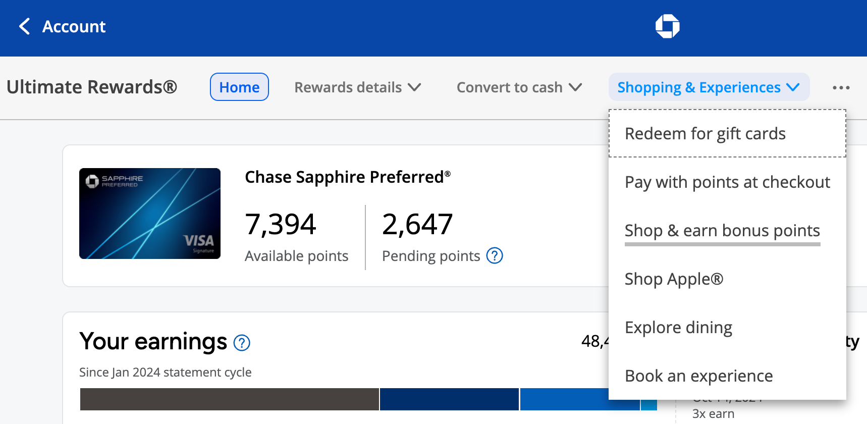 Connect by logging into your Chase account and visiting the rewards section, then hovering over “Shopping & Experiences.” The Shop Through Chase portal can be found under “Shop & earn bonus points.”