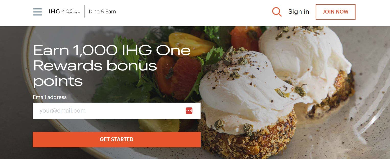IHG One Rewards Dine & Earn, or IHG Dining, is a program that lets you earn points after you sign up and dine at participating restaurants. You can even start off by earning 1,000 bonus points when you spend $30 dining at a participating restaurant and leave an online review within your first 30 days of membership.