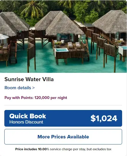 First off, you’re likely to get more bang for your buck if you use Hilton Honors points for luxury resorts that have exorbitant nightly rates. For example, you could book a Sunrise Water Villa at the Conrad Maldives Rangali Island for 120,000 points per night or $1,018 in December 2025.