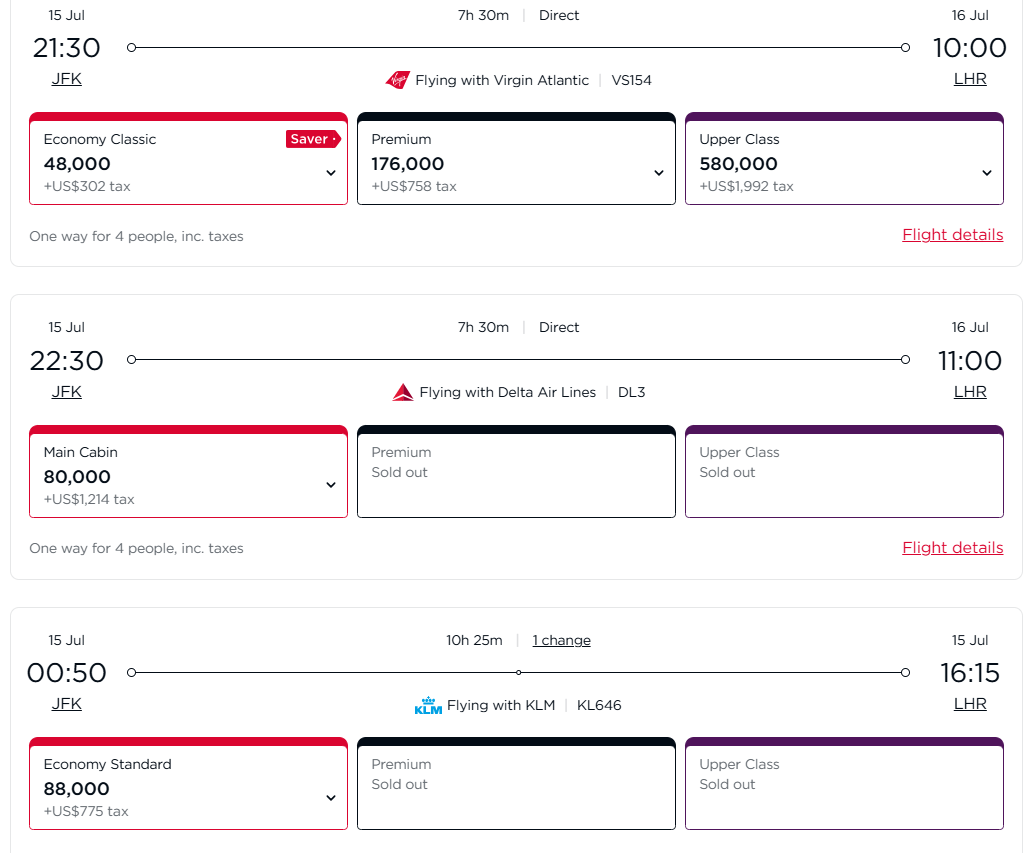 Searching for rewards flights with Virgin Atlantic is straightforward and simple. Once you're logged in, you can easily see a variety of dates and the minimum number of rewards needed for a given day. The site also shows you the total number of points needed if you're booking for several people, which I found helpful as I was booking for my family.— Brooklyn Lowery, senior credit cards editor