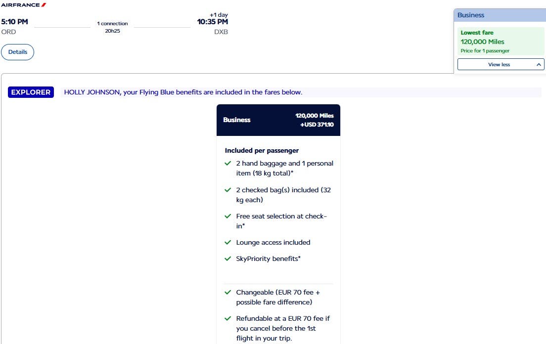 Maybe you need to fly from Chicago, Illinois to Dubai, United Arab Emirates this fall and you desperately want to fly in Business class with a lie-flat seat. In that case, it may be possible to find business class fares for as low as 120,000 miles plus $371.10 in airline taxes and fees.