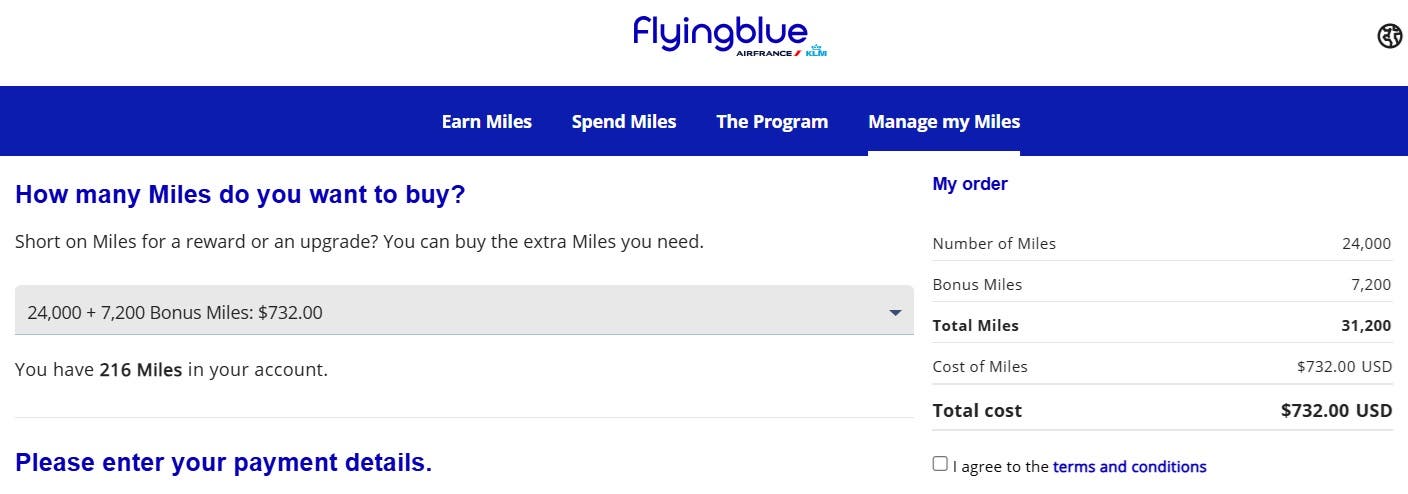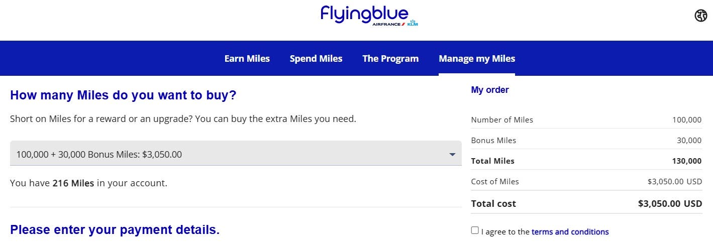 For example, you may be able to buy Air France (Flying Blue) miles for a cost of 2.34 cents per mile. While that definitely seems like a lot, it could pay off when you need to book a pricey flight.