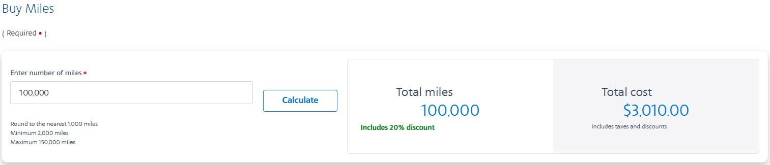 The same rule applies for buying American AAdvantage miles. This program is offering a 20 percent discount on purchased miles at the time of writing, which is nice, but they’re still asking $3,010 for 100,000 miles. This works out to a cost of just over 3 cents per mile.