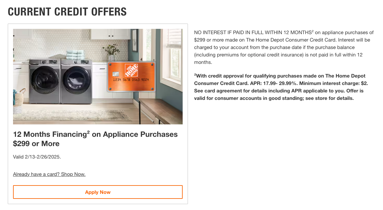 Here’s an example of how deferred interest plays out in the real world. Though it’s hardly the only retailer offering these types of offers, Home Depot often extends deferred interest on its retail cards. The Home Depot® Consumer Credit Card* backed by Citi, for example, offers a “12 Months Financing on Appliance Purchases” promotion of $299 or more at the time of writing.