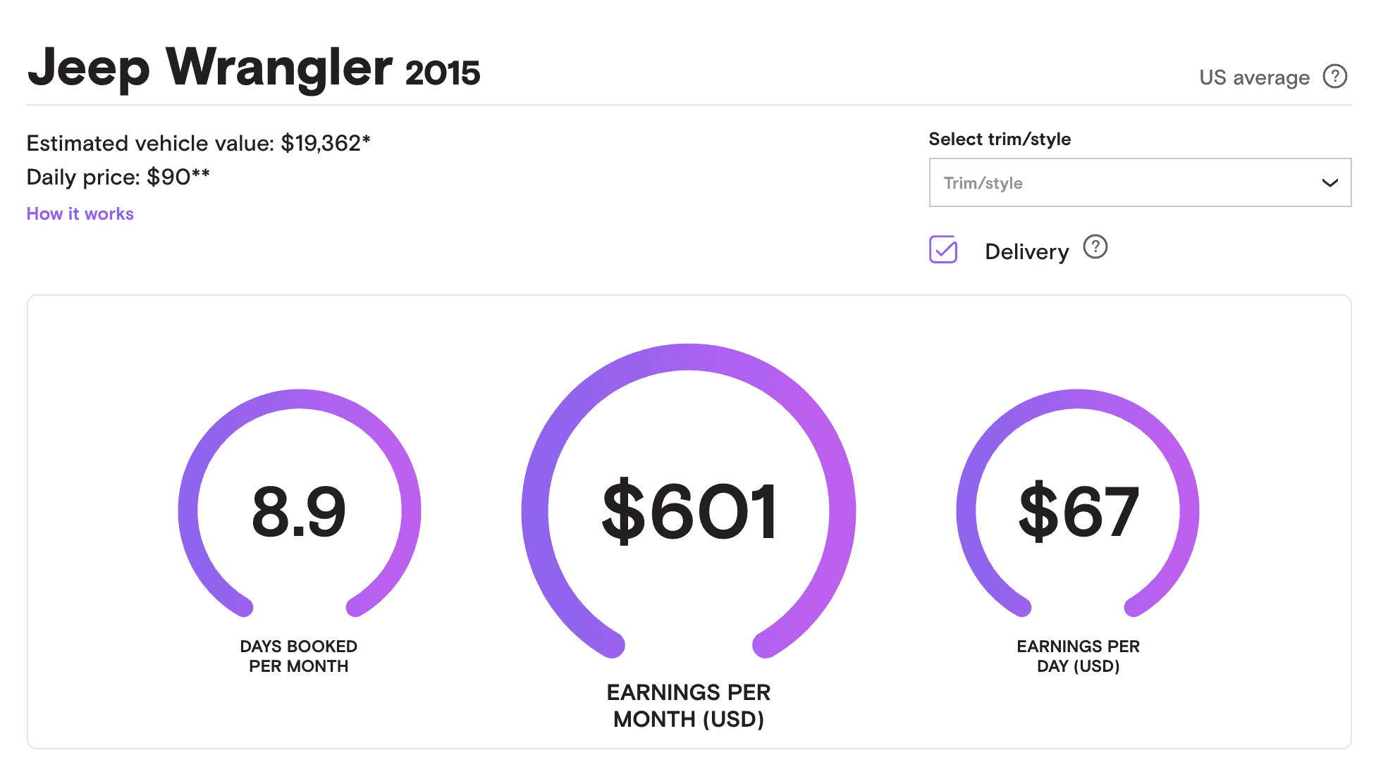 The daily price through Turo is $90, with an average of 8.9 days booked per month, for an earning of $601 per month.