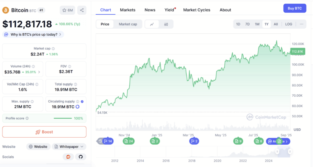 The example below of a Bitcoin (BTC) chart comes from CoinMarketCap. This chart, which is not live, is for illustrative purposes only and depicts Bitcoin’s various values from a single moment in time that has passed.