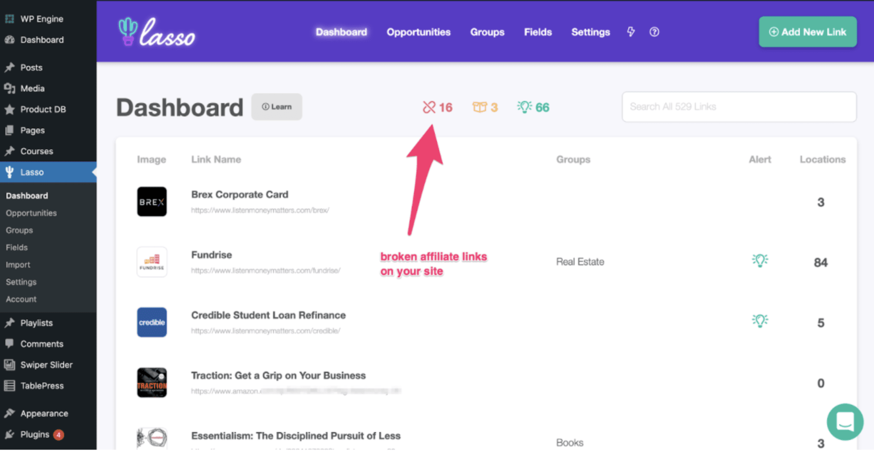 With Lasso, you’ll see broken link alerts in your dashboard automatically, as you’ll see in the image below.