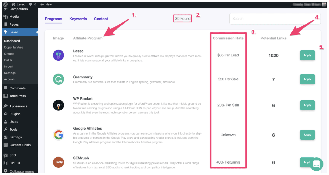 - Find monetization opportunities: Lasso will scan your site for recommended affiliate programs. You can also use Keywords to find and monetize specific anchor text across your site.