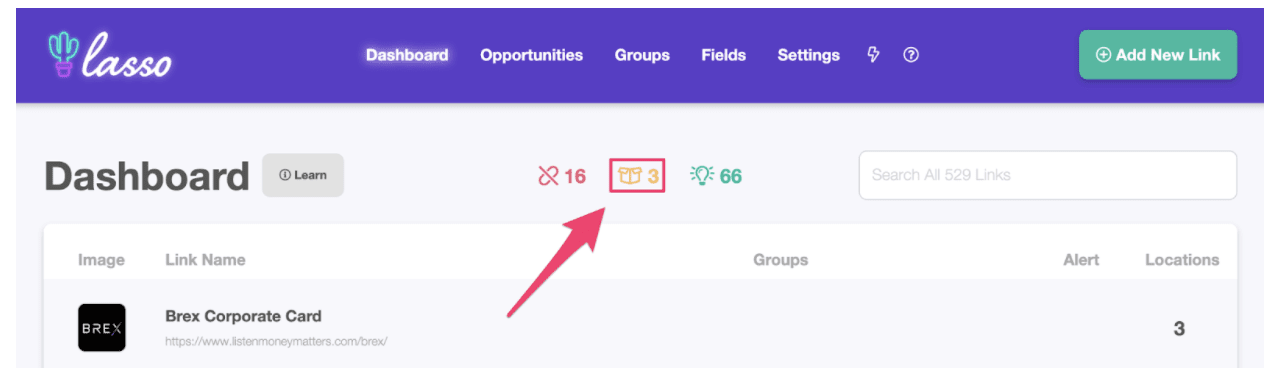 In your dashboard, under “Opportunities” is where Lasso looks for additional ways to monetize your site.