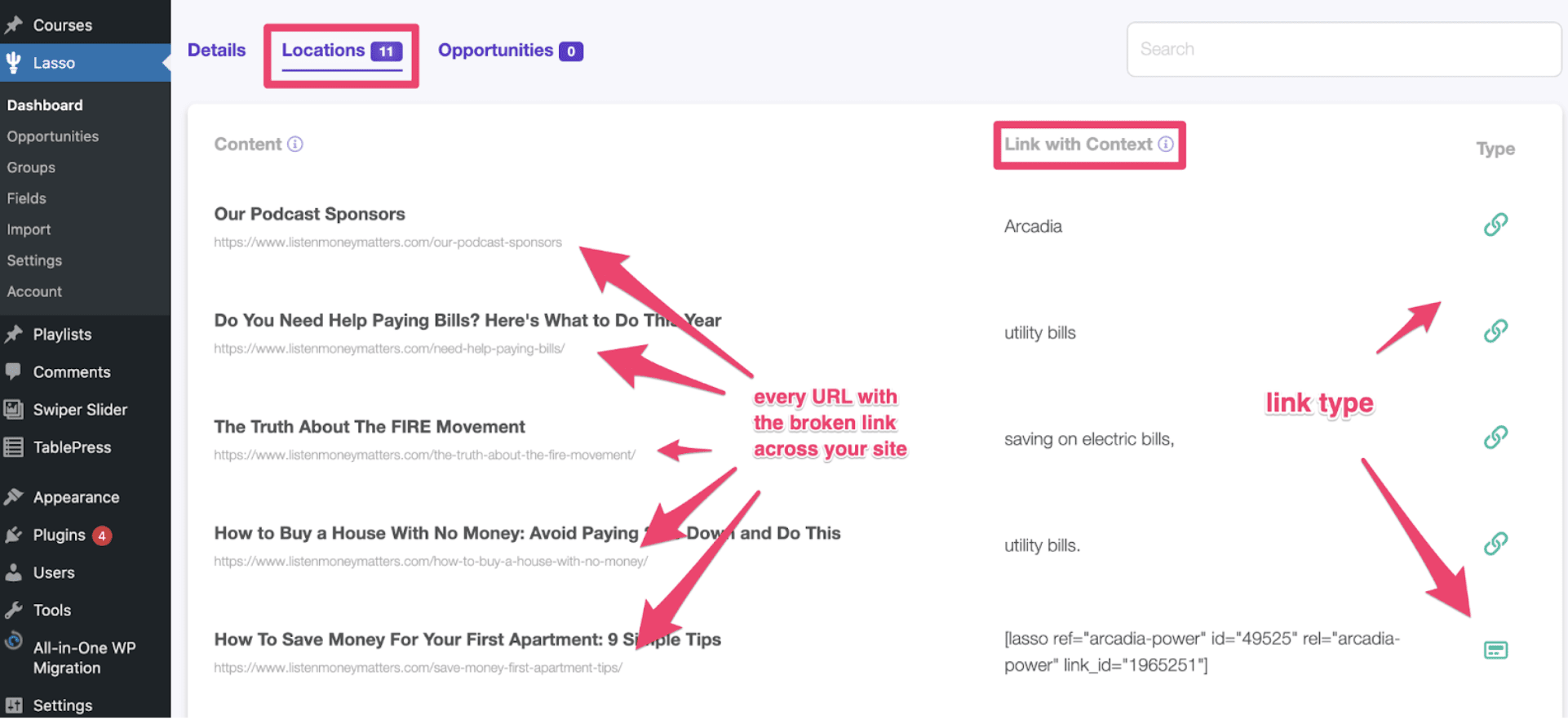 Lasso scans your site, finding every broken Arcadia Power affiliate link. This page shows us three things: