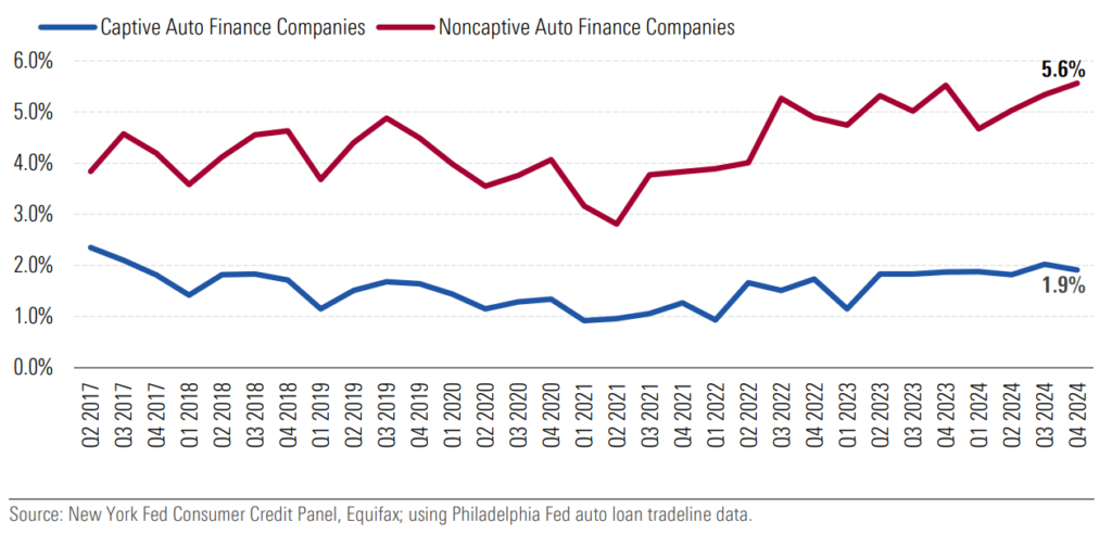 Captive lenders, or automakers’ in-house financing arms, generally attract higher-credit car buyers, sometimes with introductory APR offers. And yet, the delinquency rates on loans from this lender type remain stubbornly high as compared to pre-COVID-19 figures.