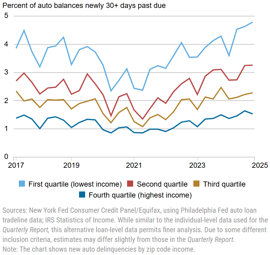 While mortgage delinquency rates are similar to pre-pandemic levels, auto loan delinquency transition rates remain elevated. High auto loan delinquency rates are broad-based across credit scores and income levels.— Wilbert van der Klaauw, economic research advisor at the New York Fed.