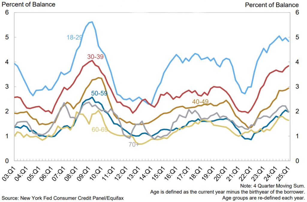 Although borrowers in their 20s are more than two times likelier than seniors to become delinquent, you can see the trend lines ticking upward across every generation, according to the New York Fed’s quarterly May 2025 report on household debt and credit.