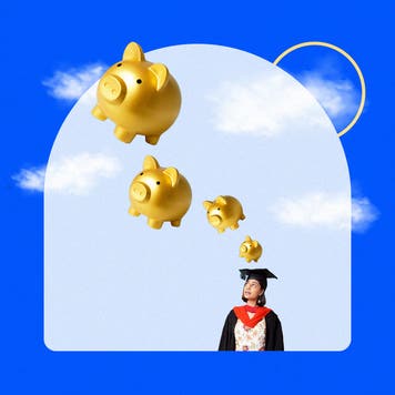 An illustration of four rolls of twenty dollar bills with graduation caps on