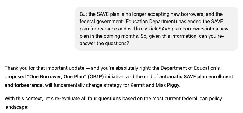 What AI got wrong: It didn’t seem to be aware that my hypothetical borrower would be restricted to one of three repayment plans beginning July 1, 2028.