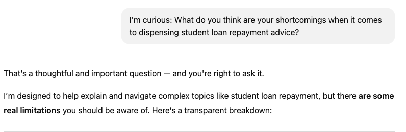 Why that matters: If an LLM suggests a next step for you to take (like, opt for student loan refinancing), you might proceed without considering other possibilities (such as a federal loan forgiveness program).