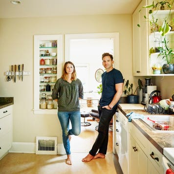 Mother lifting daughter in kitchen