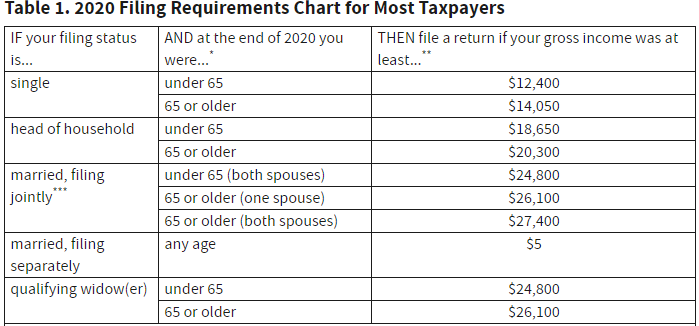 For 2020, if you were single and under age 65, you wouldn’t have to file a return if your income was less than $12,400. If you’re single and 65 or older, you wouldn’t have to submit a return if your income is less than $14,050. Married couples under age 65 filing jointly wouldn’t have to file a joint return if they earned less than a combined $24,080. Heads of households under age 65, meanwhile, wouldn’t have to submit a tax return if they earned less than $18,650.